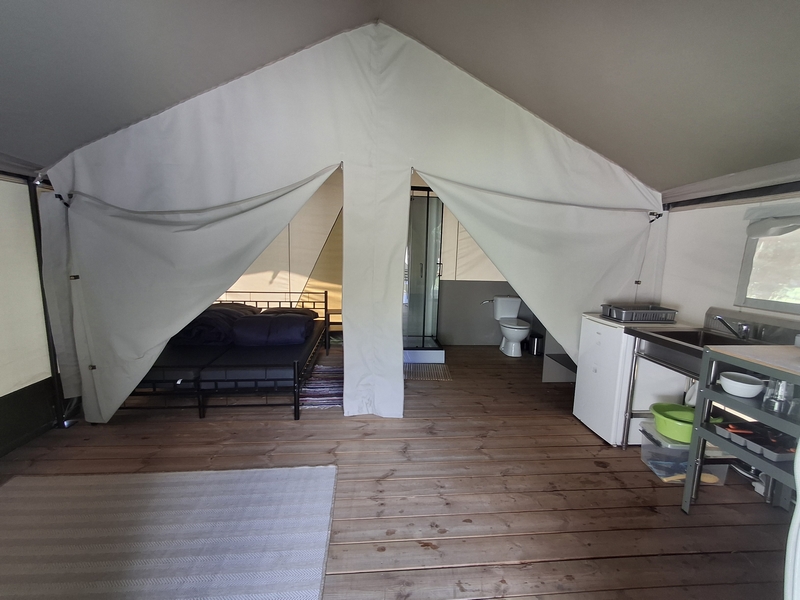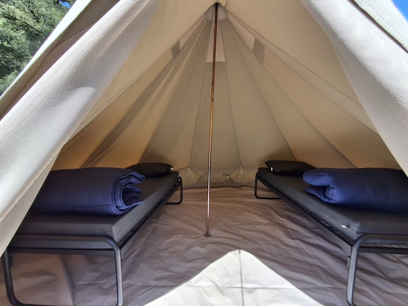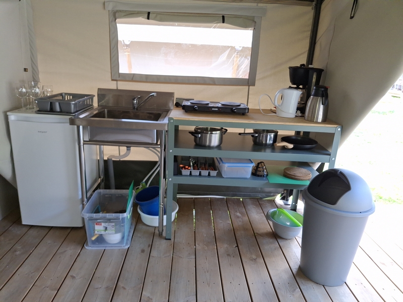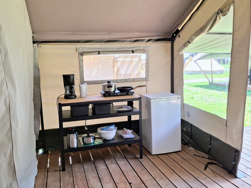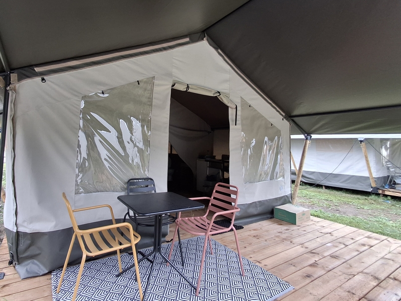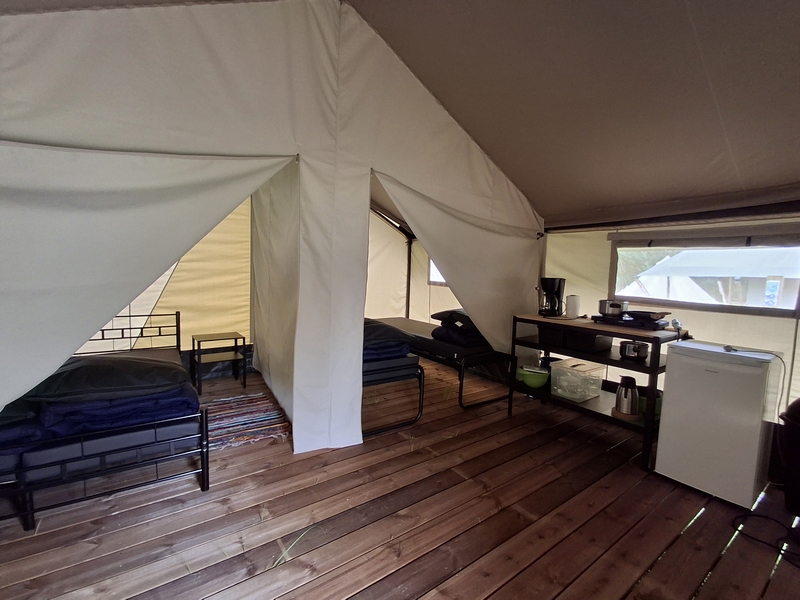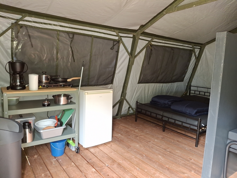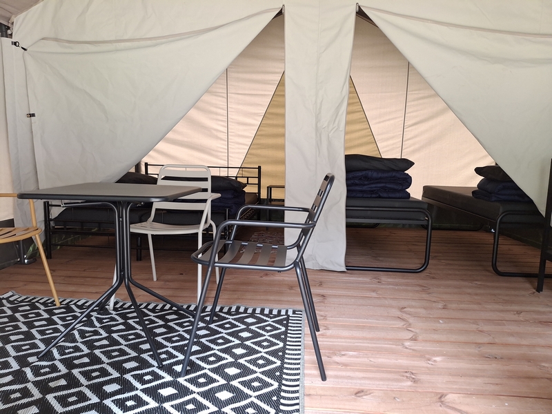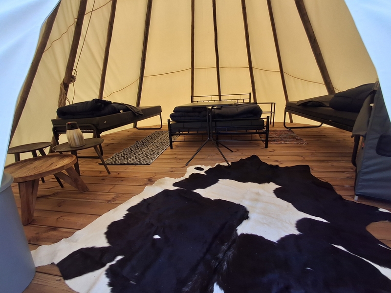 Middenop de camping staat onze imposante Tipi tent, welk is ingericht voor 3 personen. De tent staat op een vlonder is van alle gemakken voorzien, zoals een mooi houten terras, echte fijne bedden, 1 x 2-persoonsbed, 2 x 1-persoonsbed, inventaris, tafel, fijne stoelen, etc.