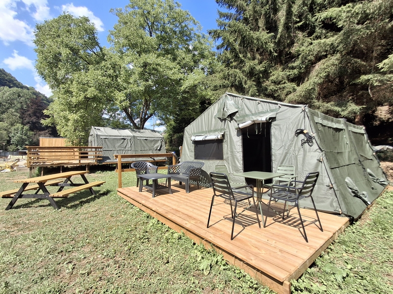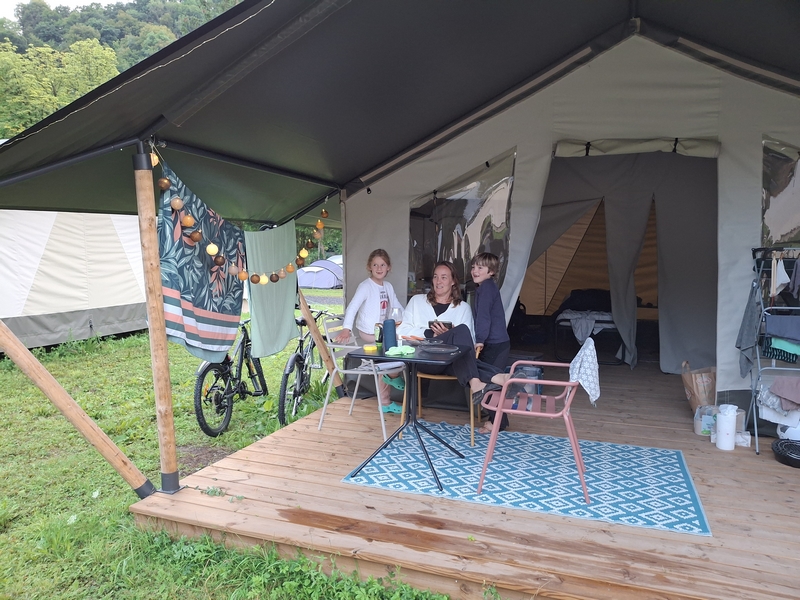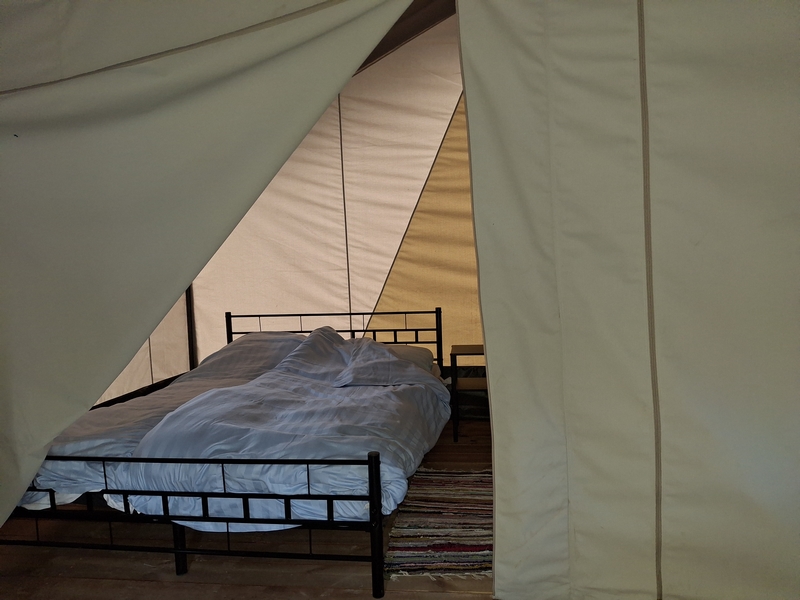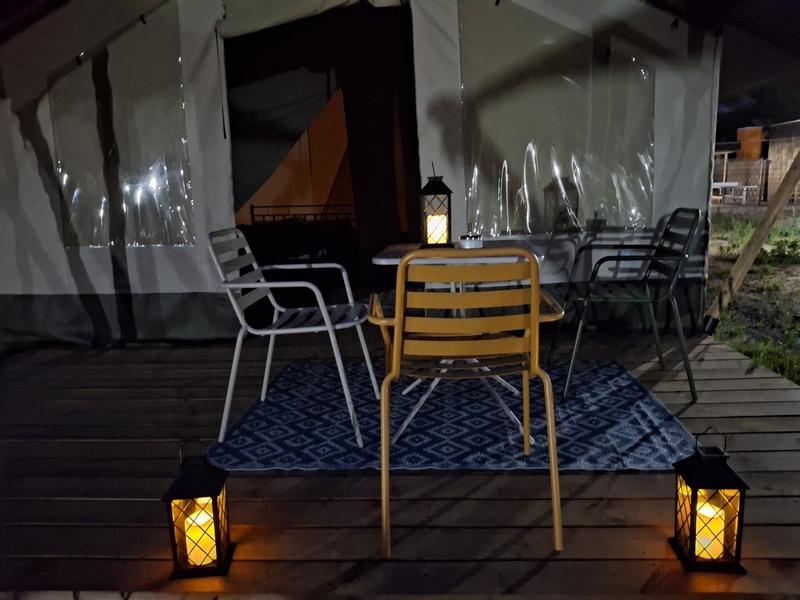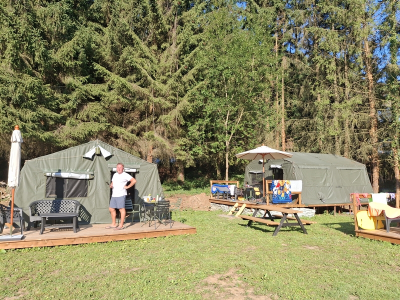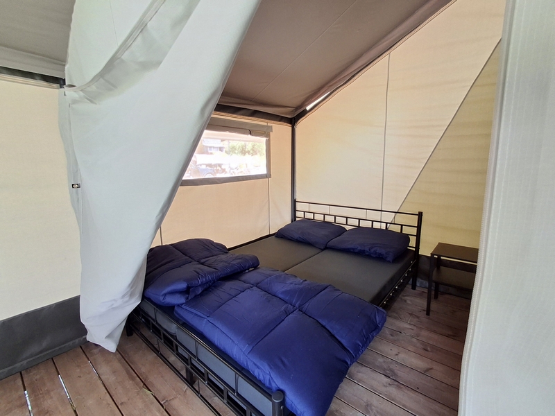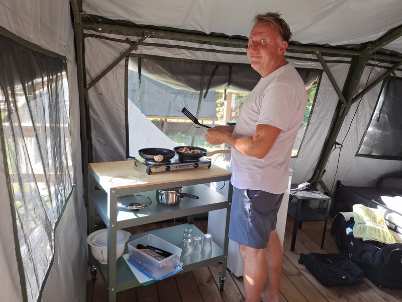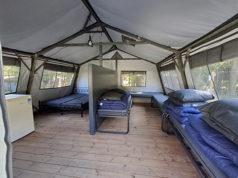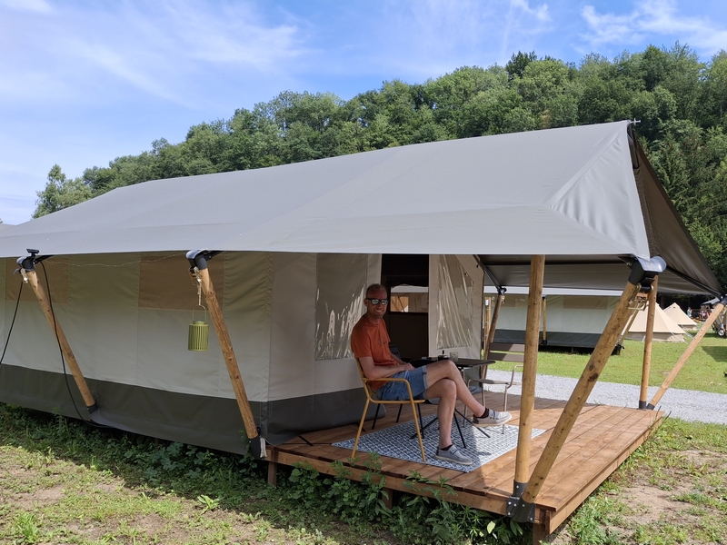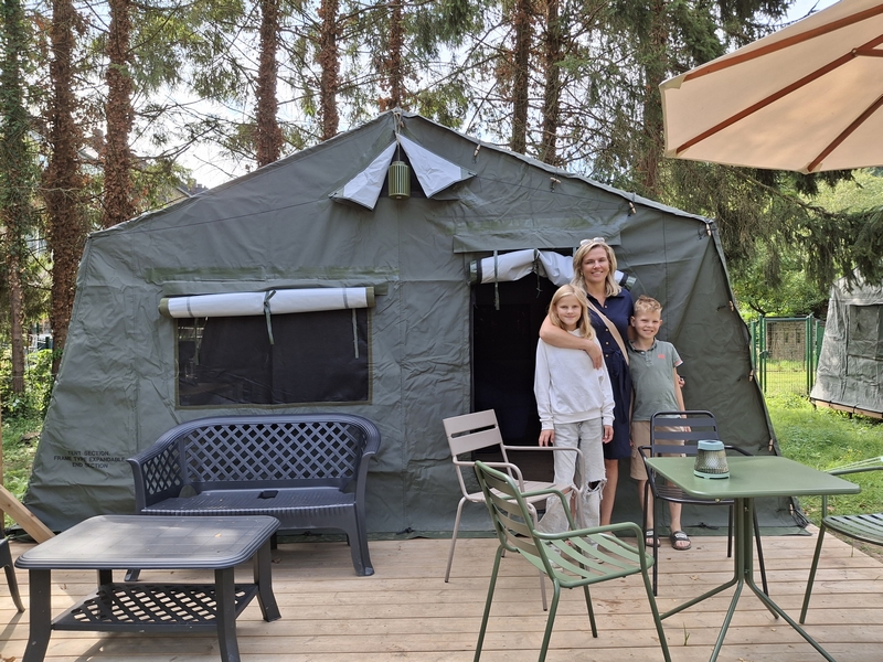 Middenop de camping staat onze imposante Tipi tent, welk is ingericht voor 3 personen. De tent staat op een vlonder is van alle gemakken voorzien, zoals een mooi houten terras, echte fijne bedden, 1 x 2-persoonsbed, 2 x 1-persoonsbed, inventaris, tafel, fijne stoelen, etc.
