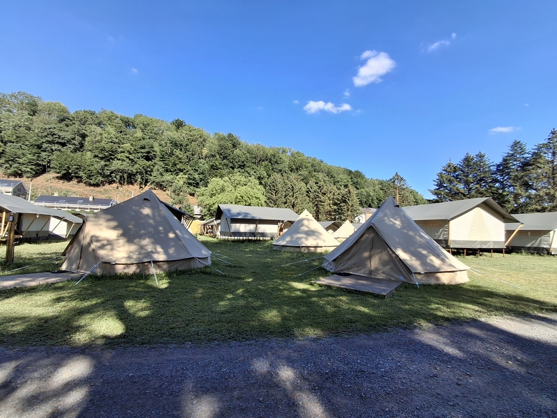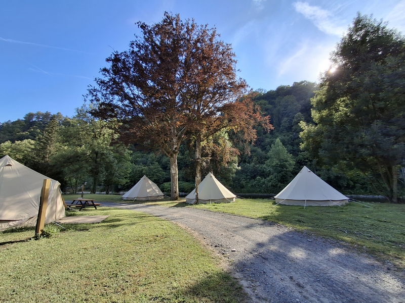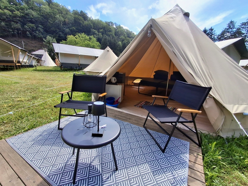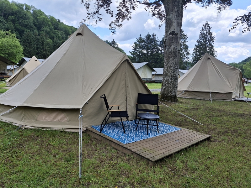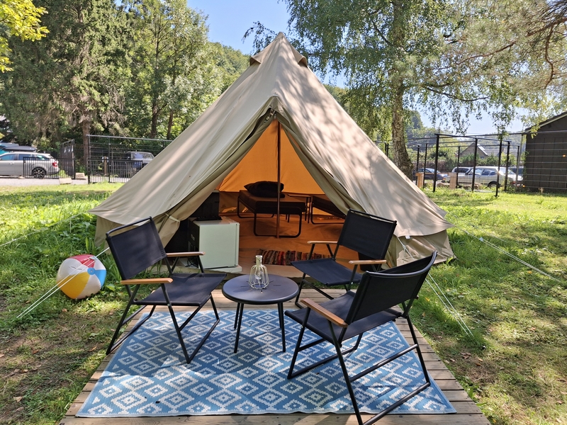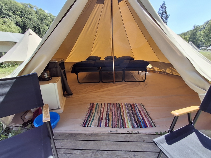 Verspreid over de camping staan onze hippe ingerichte Bell tenten voor 3 personen. De tenten beschikken over een vlonder voor de deur en zijn van alle gemakken voorzien, zoals een mooi houten terras, echte fijne bedden, 3 x 1-persoonsbed, inventaris, tafeltje met solar verlichting, fijne stoelen, etc.